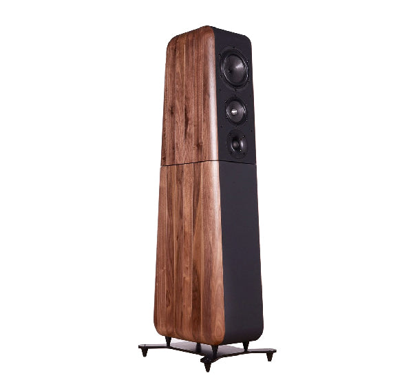 Solid walnut and HDF. The structure comprises two cabinets: the lower contains two subwoofers; the upper contains one woofer, onemidrange and one tweeter. The two wood cases are separated by fourcylindrical proprietary-engineered elastomeric puffersacting as vibration decouplers to dissipate mechanical energy by orthogonalelongationSize & Weight