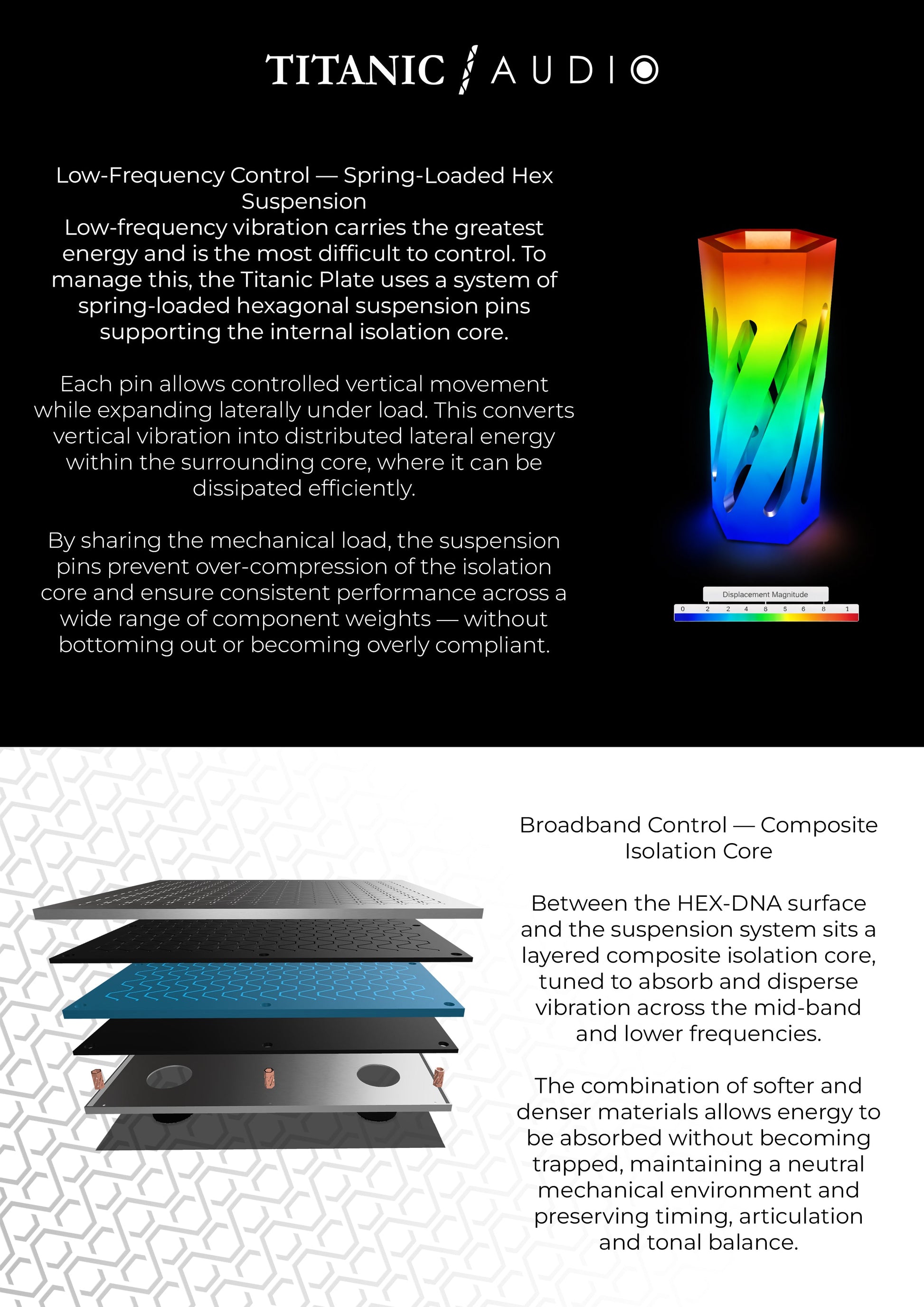 Rather than relying on mass alone, the Titanic Plate applies a Tri-Axis isolation approach, combining geometry-based dispersion, controlled suspension and layered absorption to manage vibration across the full mechanical spectrum.