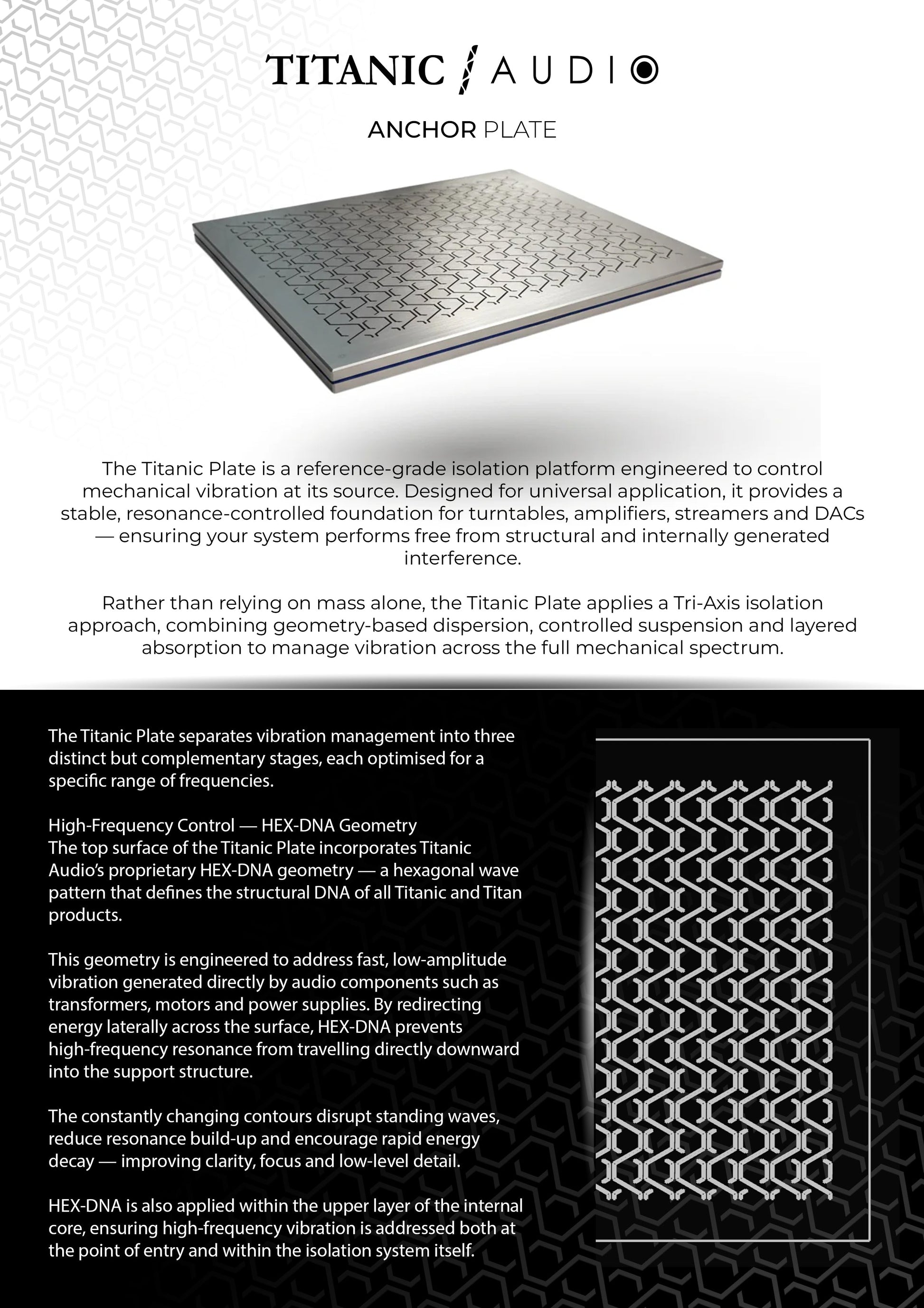 The top surface of the Titanic Plate incorporates Titanic Audio’s proprietary HEX-DNA geometry — a hexagonal wave pattern that defines the structural DNA of all Titanic and Titan products.